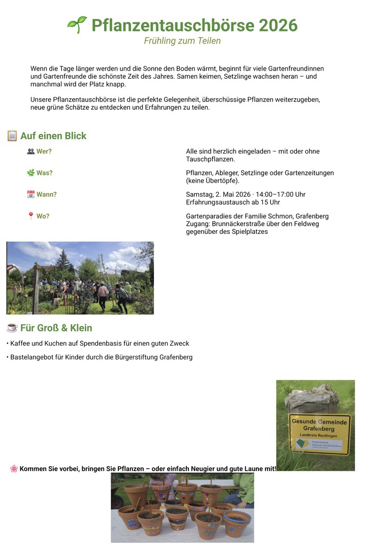 Organisiert von Familie Schmon und der Bürgerstiftung Grafenberg bot der Tauschmarkt eine bunte Vielfalt an Blumen, Gemüsepflanzen, Kräutern und Stauden. Hobbygärtnerinnen und -gärtner nutzten die Gelegenheit, überschüssige Pflanzen aus dem eigenen Garten gegen neue Sorten einzutauschen, sich fachlich auszutauschen und wertvolle Tipps rund ums Gärtnern zu erhalten. Großzügige Pflanzenspenden der Gärtnereien Handel und Vatter brachten unter anderem Geldspenden von begeisterten Gärtnern ein. Es konnten an diesem Tag über 800 Euro für eine Murmelbahn auf dem Waldspielplatz Grafenberg gesammelt werden. Eine Mitmachaktionen für Kinder sowie Kaffee und Kuchen rundeten den gelungenen Tag ab. Viele Besucherinnen und Besucher äußerten den Wunsch, die Veranstaltung zu wiederholen.