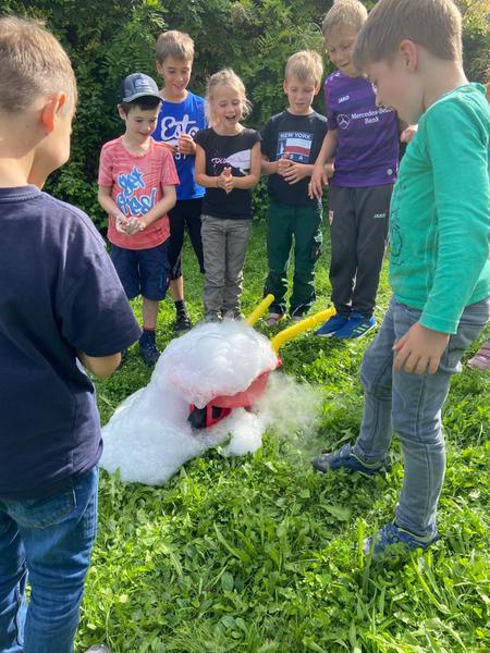 Die Begeisterung der Kinder war beim Starten mehrerer kleiner Vulkane im Garten sehr groß. Hierbei wurden Vulkane mittels kleiner Erdhügel angehäuft und mithilfe von Backpulver, Wasser, Essig und Lebensmittelfarbe ein Lava- Ausbruch simuliert. Abgerundet wurde das Experiment mit der Beobachtung eines spektakulären Trockeneis- Vulkans in einer Schubkarre. Die Kinder waren begeistert die Reaktionen zu beobachten und freuten sich sehr über eine Zugabe.